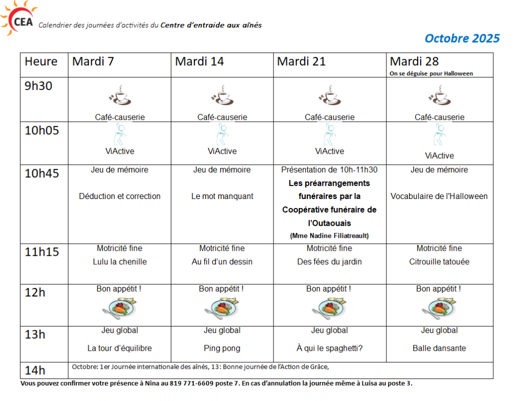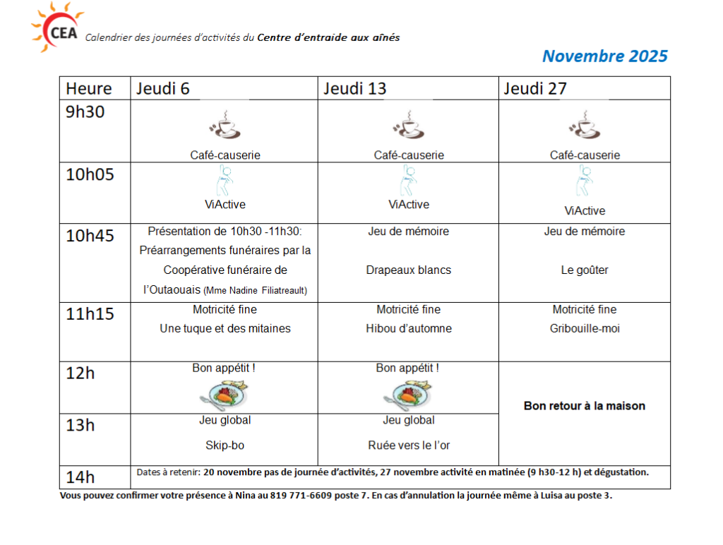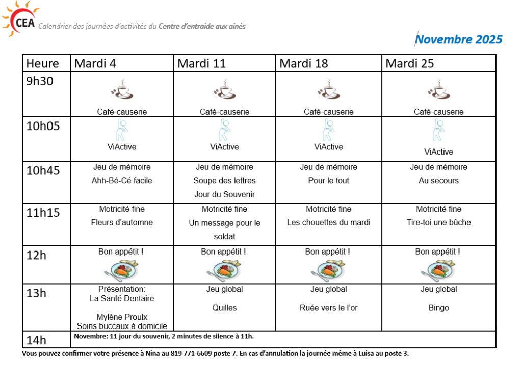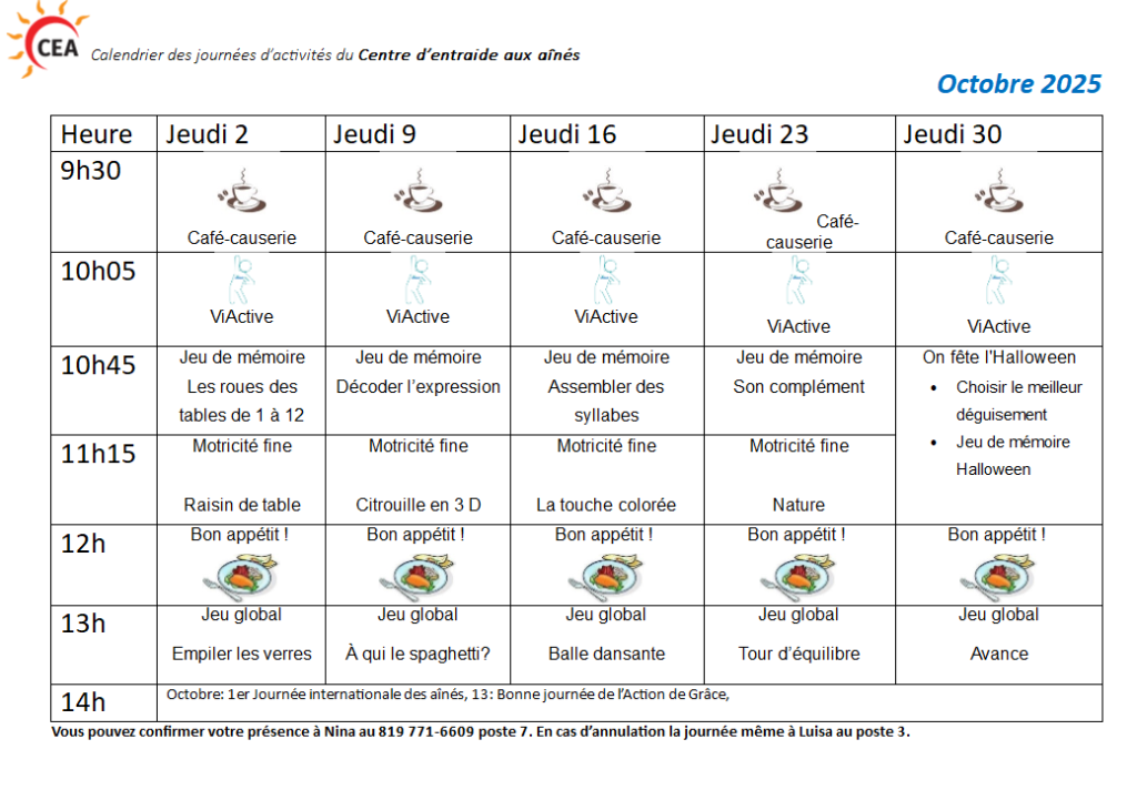 Horaire des journées d’activités de 2025
